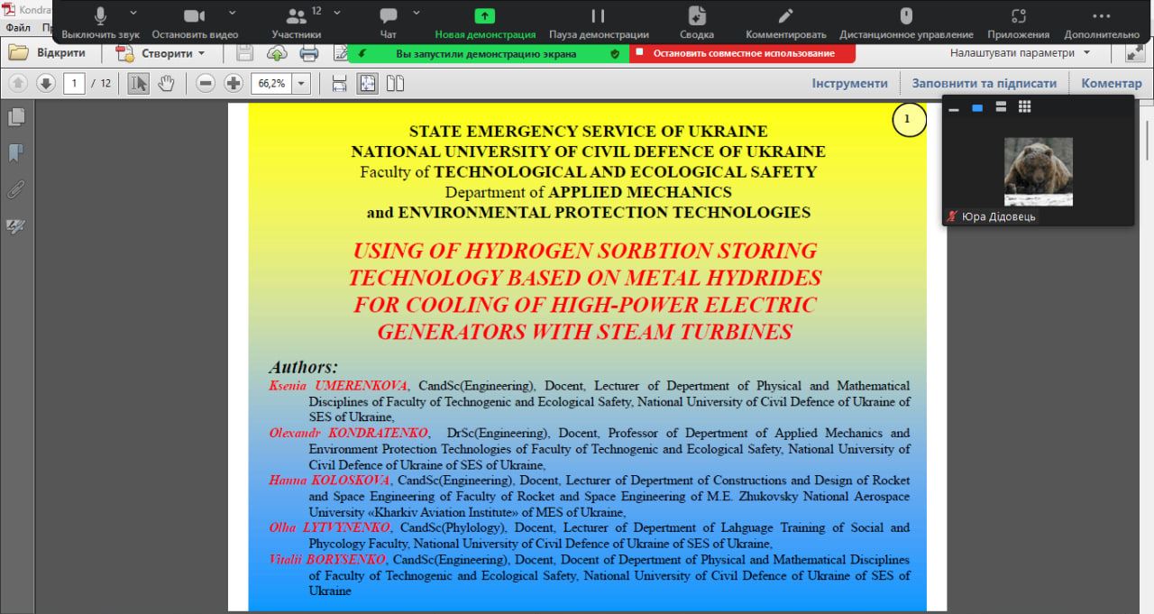 Олександр КОНДРАТЕНКО, професор кафедри прикладної механіки та технологій захисту навколишнього середовища, д.т.н., доцент, виступив з доповіддю на тему «Implementation of hydrogen storage technoligy based on metal hydrides into the high-power electric machines cooling systems». Це результати дослідження авторського колективу авторів, до якого увійшли також Ксенія УМЕРЕНКОВА, викладач кафедри фізико-математичних дисциплін факультету техногенно-екологічної безпеки НУЦЗ України, к.т.н., доцент, Володимир КОЛОСКОВ, завідувач кафедри прикладної механіки та технологій захисту навколишнього середовища факультету техногенно-екологічної безпеки НУЦЗ України, к.т.н., доцент, Ганна КОЛОСКОВА, завідувач кафедри конструкцій і проектування ракетної техніки факультету ракето-космічної техніки Національного аерокосмічного університету ім. М.Є. Жуковського «ХАІ», к.т.н., доцент, Ольга ЛИТВИНЕНКО, доцент кафедри мовної підготовки соціально-психологічного факультету НУЦЗ України, к.філол.н., доцент, та Віталій БОРИСЕНКО, доцент кафедри фізико-математичних дисциплін факультету техногенно-екологічної безпеки НУЦЗ України, к.ф.-м.н., доцент.