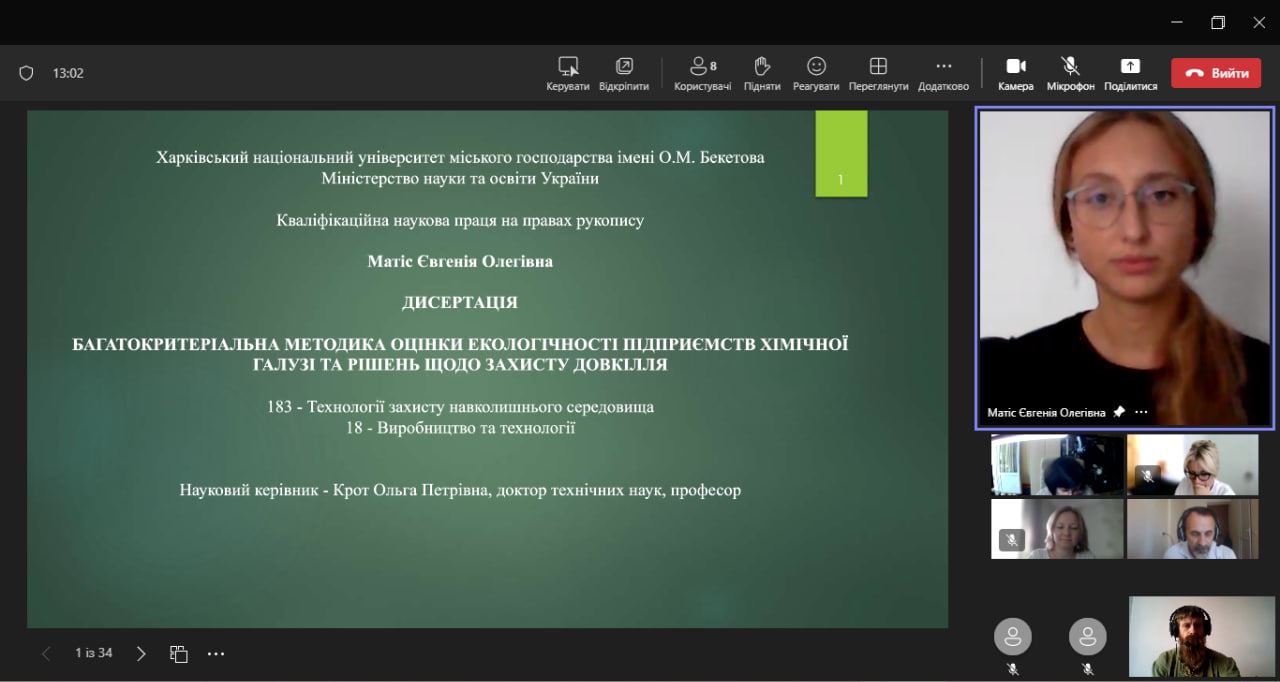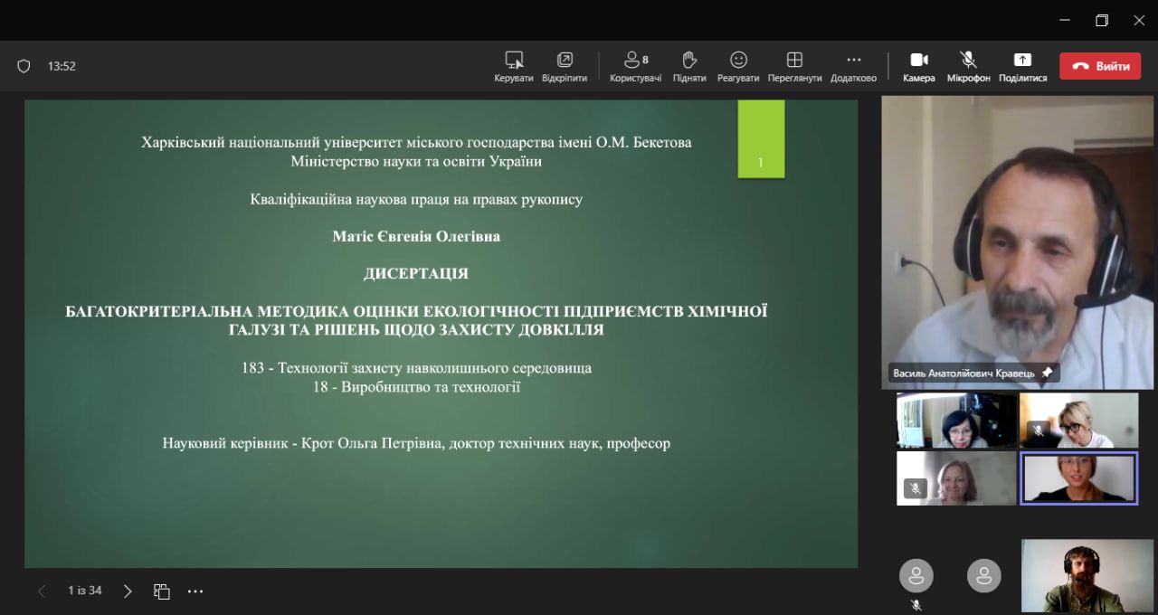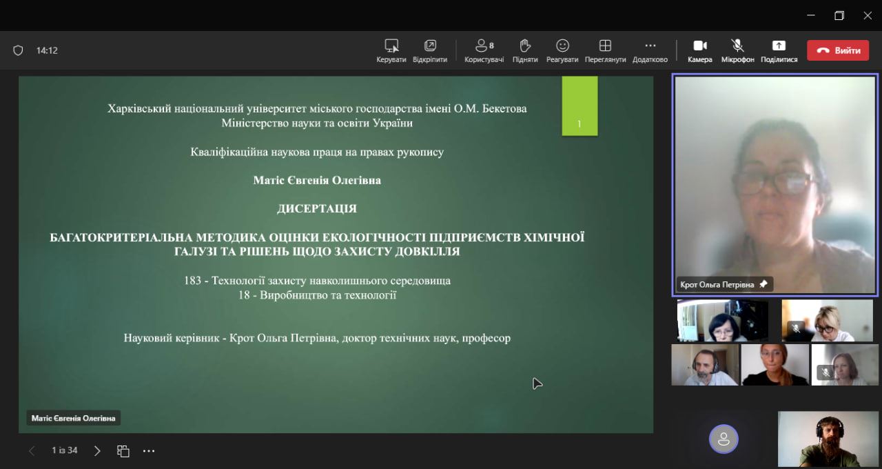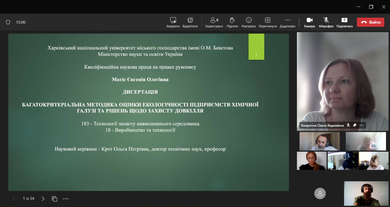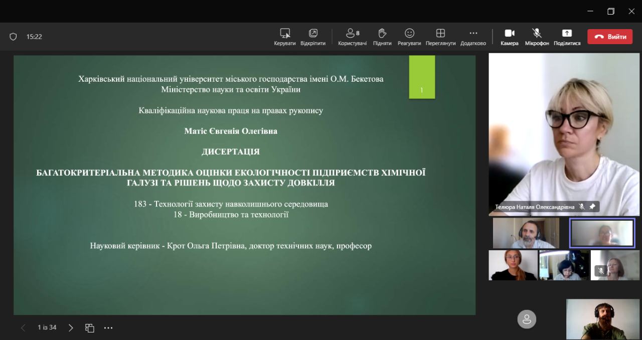 30 серпня 2024 р. відбулося засідання разової спеціалізованої вченої ради ДФ 64.089.30 у Харківському національному університеті міського господарства ім. О.М. Бекетова, утвореної відповідно до Наказу ХНУМГ № 315-01 від 18.07.2024 р., щодо прилюдного захисту дисертаційного дослідження здобувачки Євгенії МАТІС на тему «Багатокритеріальна методика оцінки екологічності підприємств хімічної галузі та рішень щодо захисту довкілля» за рівнем «Доктор філософії» за спеціальністю 183 «Технології захисту навколишнього середовища» в галузі знань 18 «Виробництво та технології».