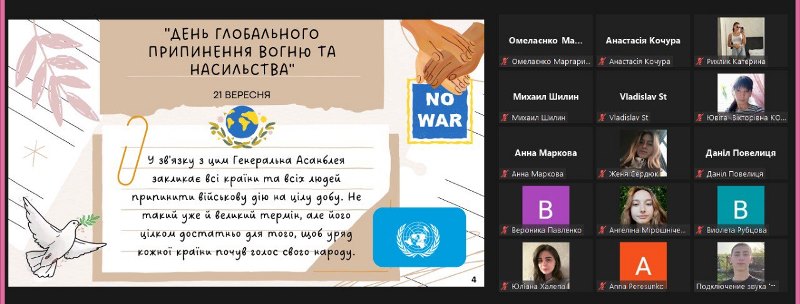 19 вересня 2024 р. доцент кафедри охорони праці та екологічної безпеки Олена БРИГАДА провела кураторську годину на тему «День Миру» для здобувачів вищої освіти, які навчаються на факультеті управління та безпеки населення за ОПП «Екологічна безпека» і «Охорона праці».