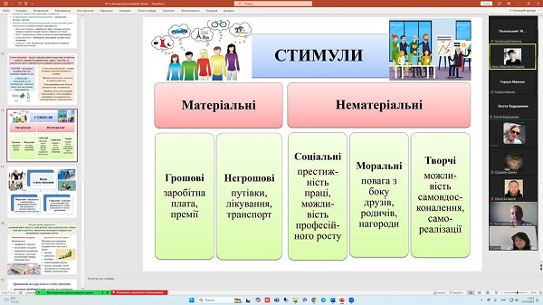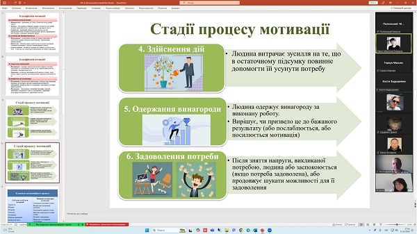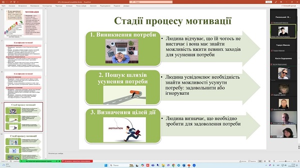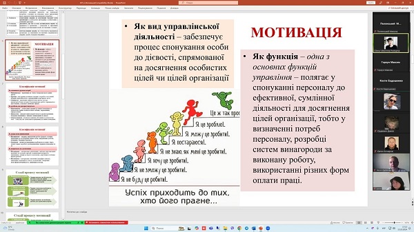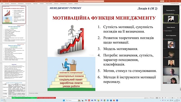 15 жовтня 2024 року на кафедрі менеджменту для здобувачів вищої освіти денної форми навчання (групи Т-22-731, Т-23(22)-731, ОПП «Туризм і рекреація») проведене відкриту поточну онлайн-лекцію з навчальної дисципліни «Менеджмент туризму» за темою: «Мотиваційна функція менеджменту». Лекцію проводила професор Олена Поступна. На лекційному занятті були присутні всі члени кафедри.