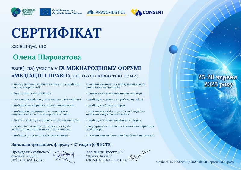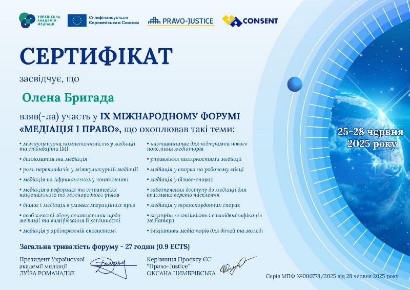 Науково-педагогічні працівники кафедри охорони праці та екологічної безпеки 25-28 червня 2025 року взяли участь у ключовій щорічній події, присвяченій питанням альтернативного врегулювання спорів, - IX Міжнародному форумі «Медіація і право», організованому спільно Українською академією медіації в рамках Проєкту ЄС «CONSENT» та Проєктом ЄС «Право-Justice».