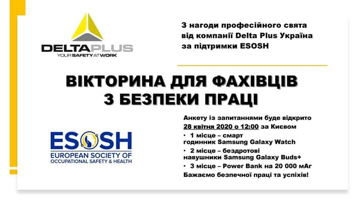 З нагоди професійного свята компанія Delta Plus Україна спільно із Европейское Сообщество по Охране Труда (ESOSH) оголошує святкову вікторину. Оскільки Delta Plus є виробником якісних засобів індивідуального захисту, то і запитання будуть здебільшого про ЗІЗ. Анкету із запитаннями буде відкрито 28 квітня о 12:00 за Києвом за цим посиланням