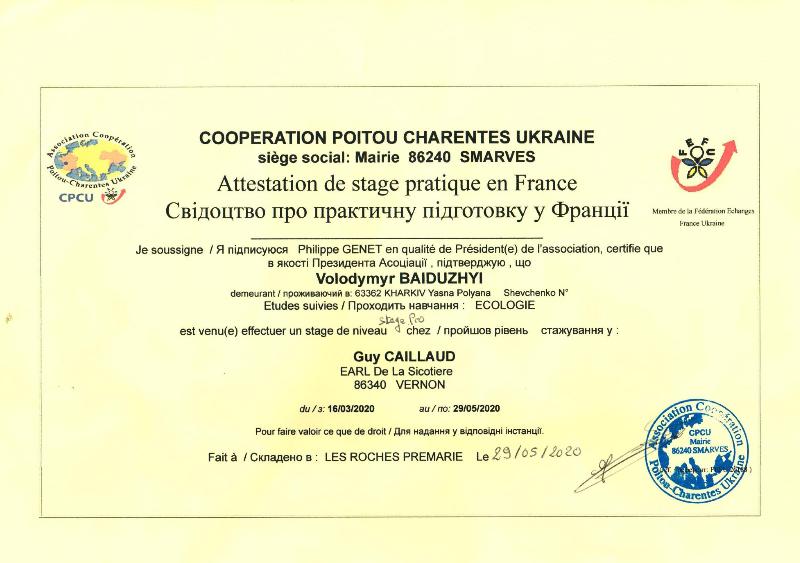 Щиро вітаємо з успішним проходженням Міжнародного стажування та отриманням відповідного сертифікату європейського зразка студента 1-го курсу магістратури Байдужого Володимира. Бажаємо йому успіхів у навчанні та майбутній професійній діяльності фахівця-еколога.