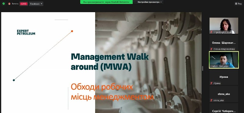 Спікер Анатолій Алексєєв - директор з охорони праці, пожежної безпеки та екології ТОВ «Експерт Петролеум Україна» - під час онлайн-зустрічі розкрив питання особливостей обходів робочих місць керівництвом («Management walks around»), чому цей процес є обов’язковою складовою ефективних систем безпеки праці, включаючи його реалізацію під час воєнного стану у країні, як себе мають поводити керівники і працівники при таких обходах тощо.