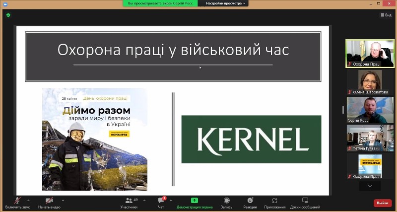 Спікер онлайн-зустрічі - випускник і тренер Школи керування ризиками Джаннет Аршимової, керівник відділу охорони праці дивізіону виробничих активів – олійноекстракційні заводи, елеватори, портові термінали компанії «Кернел», Сергій РОСС – у такий складний період сьогодення з питань організації трудової діяльності працівників торкнувся питань визначення місць перебування персоналу під час повітряної тривоги; відповідного обладнання таких місць; потреб та наповнення сучасних аптечок; а також вже наявного досвіду і особливостей відновлення робіт на деокупованих територіях.
