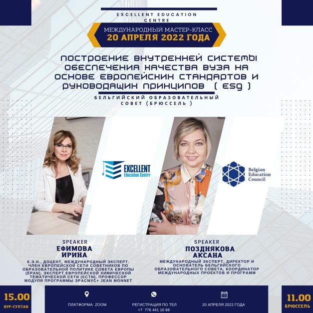 Спікерами Master Class «Побудова внутрішньої системи забезпечення якості закладу вищої освіти на основі Європейських стандартів і керівних принципів (ESG)» були міжнародний експерт, директор та засновник Бельгійської освітньої ради, координатор міжнародних програм Оксана Познякова, міжнародний експерт, член європейської мережі радників з освітньої політики ради Європи (ЕРАN), експерт європейської хімічної тематичної мережі (ECTN), професор модуля Erasmus + Jean Monnet. Єфимова Ірина.