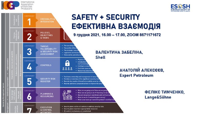 Складові системи управління безпекою в рекомендаціях Міжнародної асоціації виробників нафти та газу IOGP; критичні ризики та засоби управління; чим ПЛАС відрізняється від Emergency Plan; аудит 360°, відмінність від аудиту з охорони праці; як перевірити готовність до надзвичайних ситуацій і воєнних дій. Конструктивні практики за такими професійними та нагальними в Україні питаннями під час названого вебінару презентували фахівці, що за професійними обов’язками відповідають за напрями Safety + Security (Валентина ЗАБЕЛІНА («Shell»), Анатолій АЛЕКСЄЄВ («Expert Petroleum»), секьюріті-експерт з Німеччини Фелікс ТИМЧЕНКО («Lange& Sohne»)).