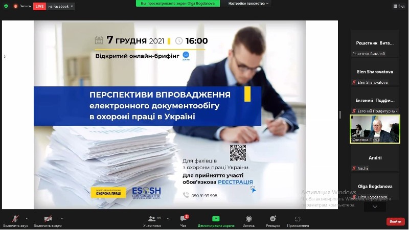 Гаранти освітніх програм «Охорона праці» та «Екологічна безпека» (доценти Олена ШАРОВАТОВА, Богдан ЦИМБАЛ, Олена БРИГАДА) та здобувачі вищої освіти – майбутні фахівці з охорони праці - взяли участь у відкритому онлайн-брифінгу для фахівців з охорони праці «Перспективи впровадження електронного документообігу в охороні праці в Україні», організованому 07 грудня 2021 року науково-виробничим журналом «Охорона праці» та Європейським співтовариством з охорони праці ESOSH. Актуальність заходу обумовлена набранням чинності Наказу Міністерства економіки України від 28 жовтня 2021 року № 839-21 «Про затвердження Порядку впровадження електронного документообігу в системі управління охороною праці».
