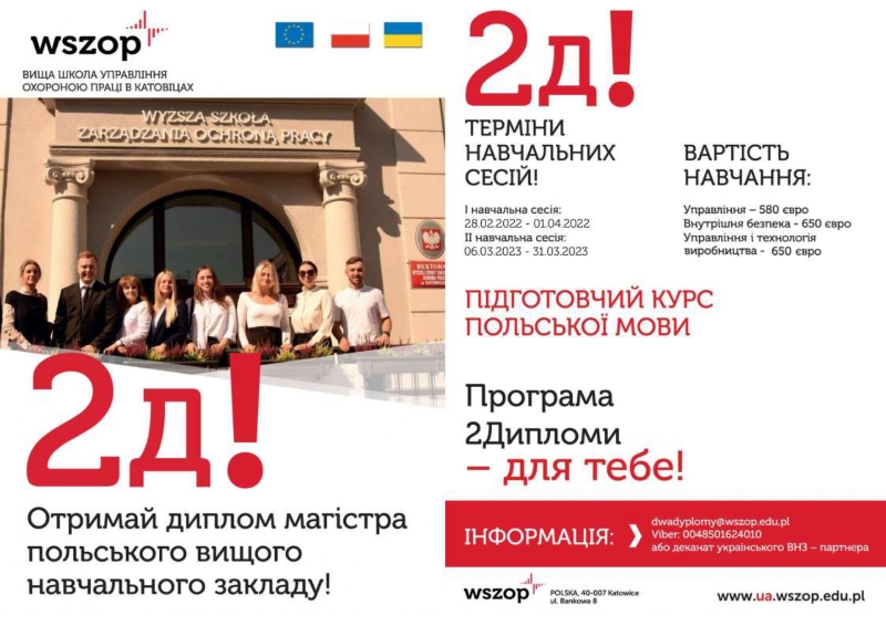 У Вищій школі управління охороною праці (м. Катовіце) продовжується набір студентів до участі у Програмі Два дипломи (для студентів-магістрів) на 2021-2022 навчальний рік.