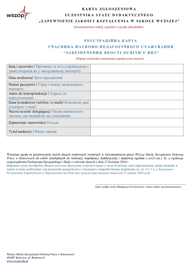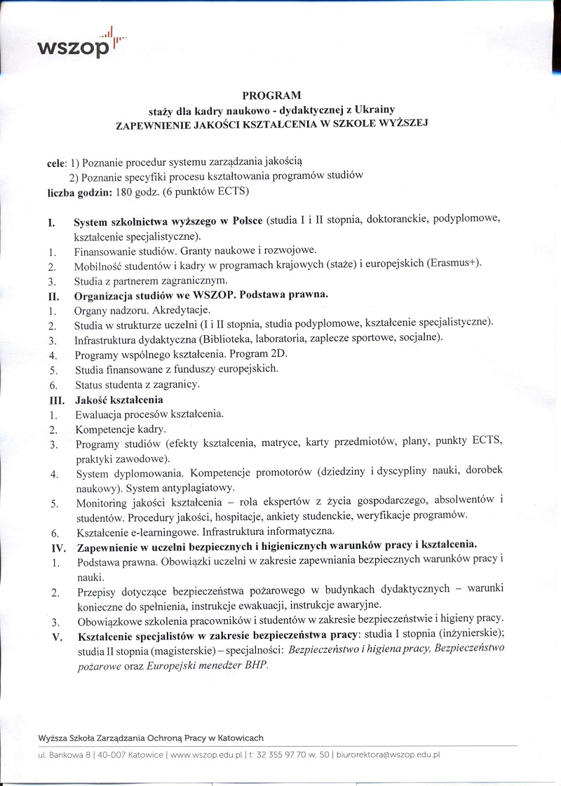 Запрошуємо наукових та науково-педагогічних працівників пройти стажування онлайн у Вищій школі управління охороною праці в Катовіце, Польща.