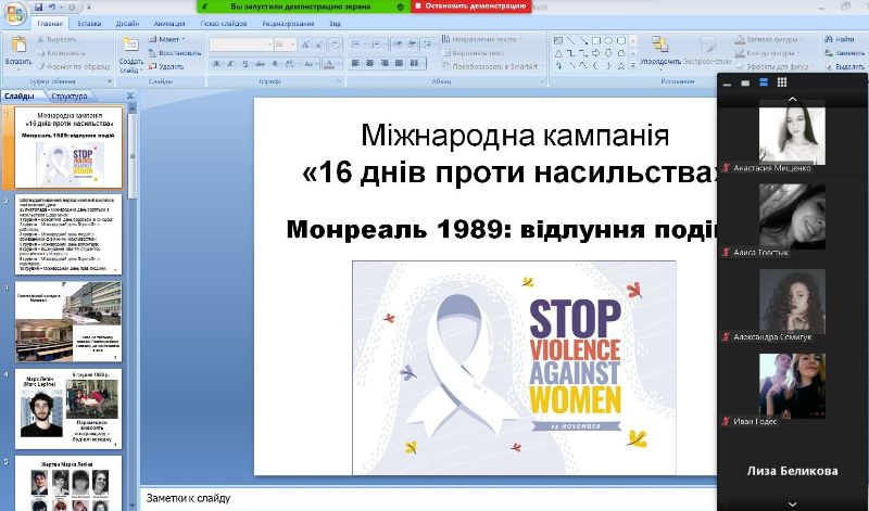 В рамках Всеукраїнської щорічної акції «16 днів проти насильства» доцентом кафедри ОП та ТЕБ Оленою Бригадою з групами ЕК-20-513 та ЕК-19-514 факультету техногенно-екологічної безпеки проведено кураторську годину «Монреаль 1989: відлуння подій».