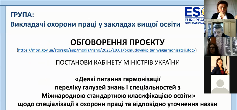 Науково-педагогічні працівниці кафедри охорони праці та техногенно-екологічної безпеки разом із колегами НУЦЗ України 27 січня 2021 року взяли участь в онлайн-форумі з обговорення ПРОЄКТУ Постанови Кабінету Міністрів України «Деякі питання гармонізації переліку галузей знань і спеціальностей з Міжнародною стандартною класифікацією освіти» щодо спеціалізації з охорони праці та відповідно уточнення назви «Охорона праці».