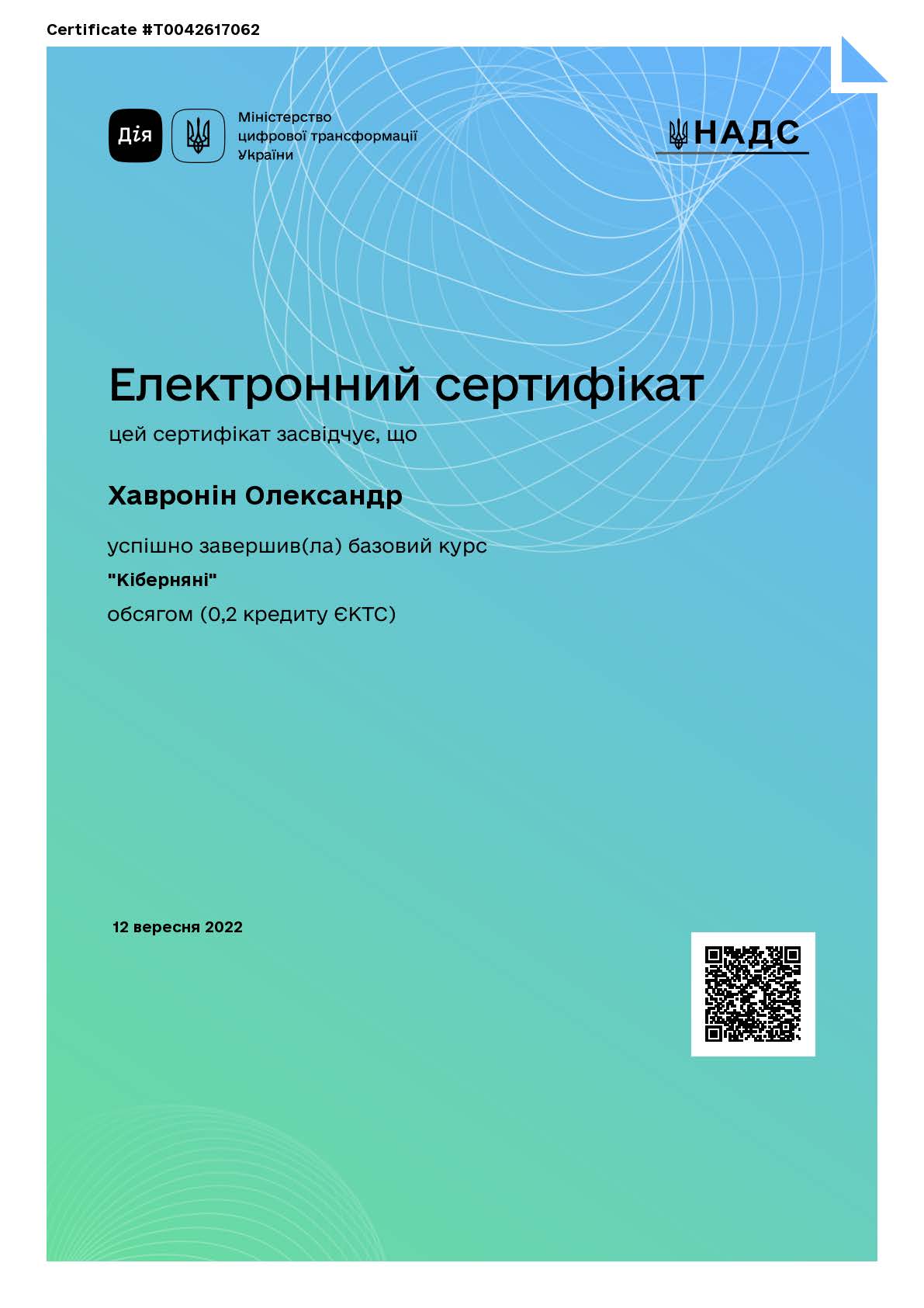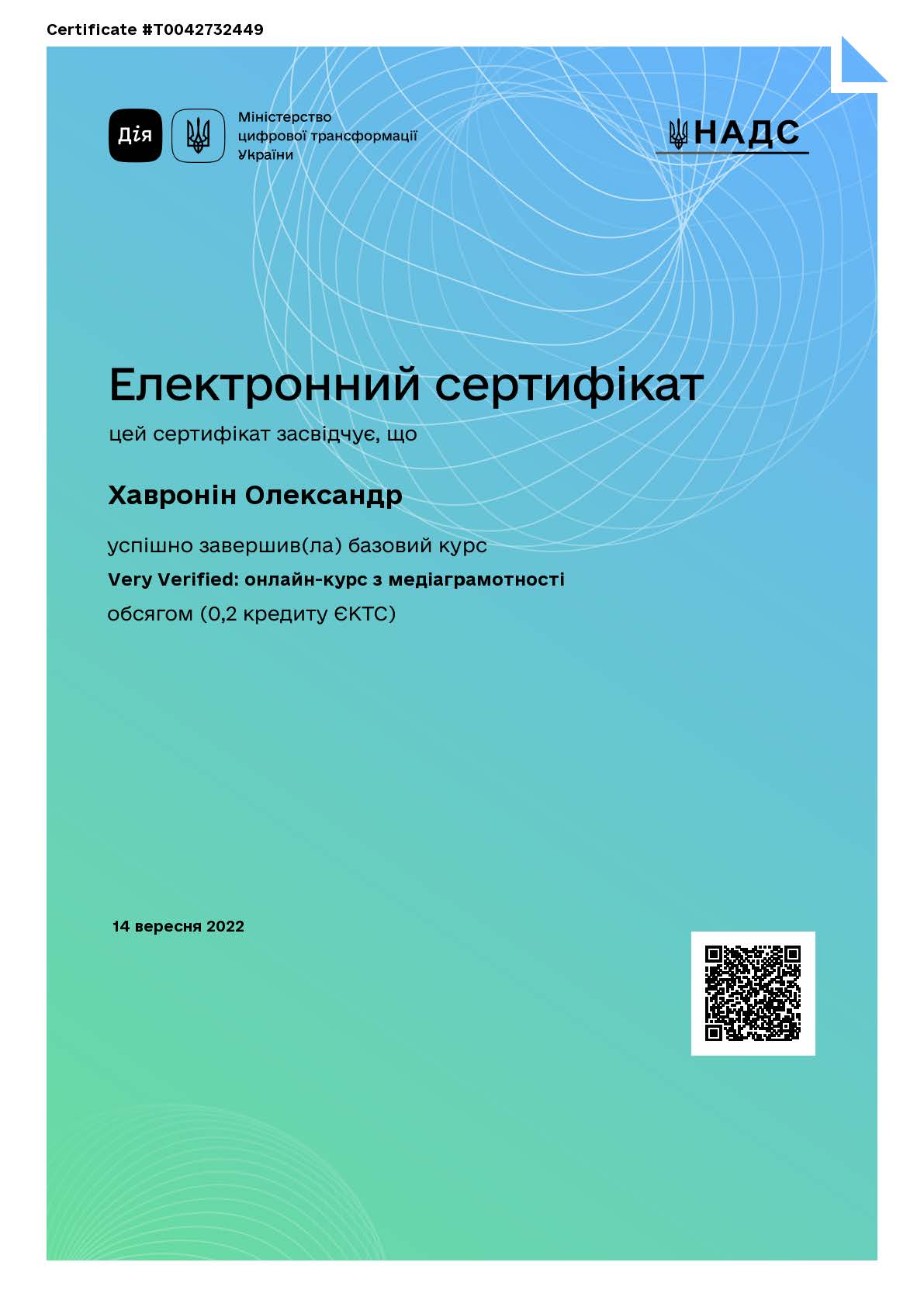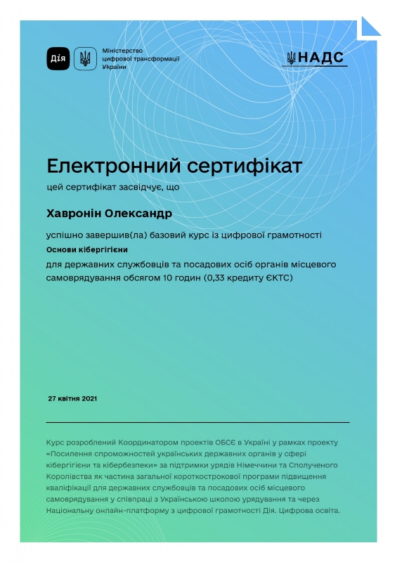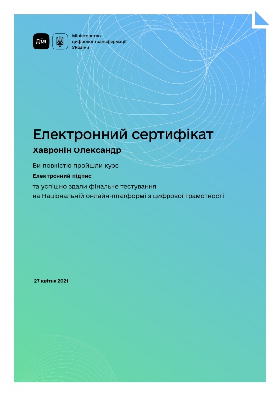 Державний сертифікат про рівень володіння державною мовою, рівень вільного володіння першого ступеня, УМД № 00042124, виданий на підставі рішення Національної комісії стандартів державної мови від 22.10.2021 р. № 233.