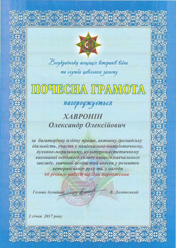 Нагороджений медаллю «Учасник військового параду» за нагоди 27ї річниці незалежності України за активну участь у підготовці та проведенні параду військ з нагоди 27ї річниці Незалежності України а також зразкове проходження урочистим маршем 24 серпня 2018 року в м.Києві. (Наказ НУЦЗУ № 294 від 06.09.2018 р.).