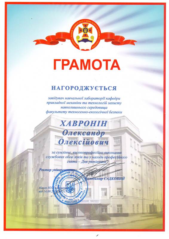 Відповідальний виконавець НДР кафедри прикладної механіки та технологій захисту навколишнього середовища НУЦЗ України «Розробка методики комплексного оцінювання впливу експлуатації та застосування спеціальної техніки на довкілля в умовах військової агресії» (№ ДР 0124U000374, 01.2024–12.2026 рр.).