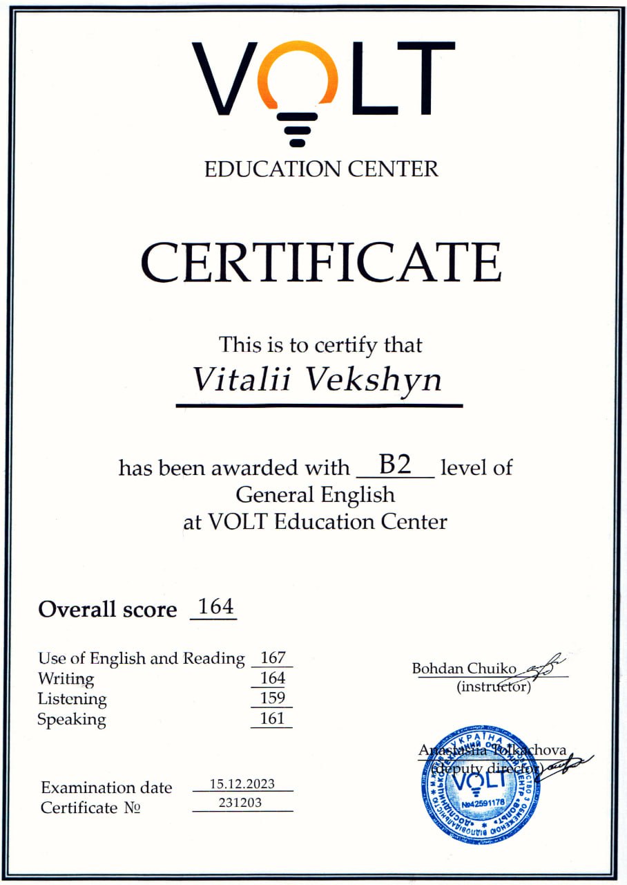 - Akademia Śląska (dawniej Wyższa Szkoła Techniczna w Katowicach), м. Катовіце, Республіка Польща, у період з 27 грудня 2023 р. по 12 квітня 2024 р., проходжу науково-педагогічне стажування за програмою «Інновації в освіті. Інноваційні технології викладання фахових дисциплін» в об’ємі 180 годин з отриманням відповідного сертифіката