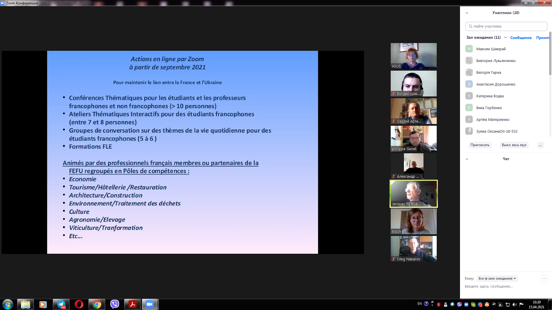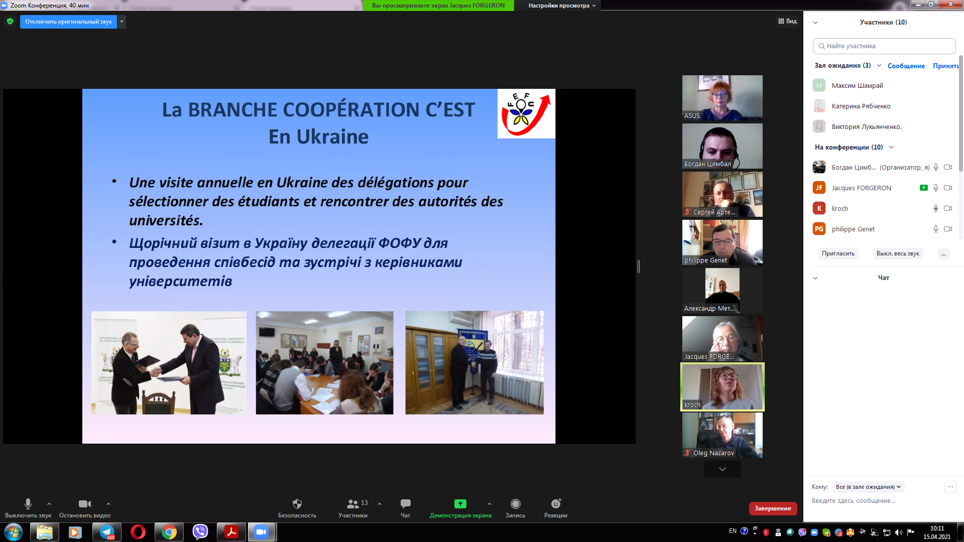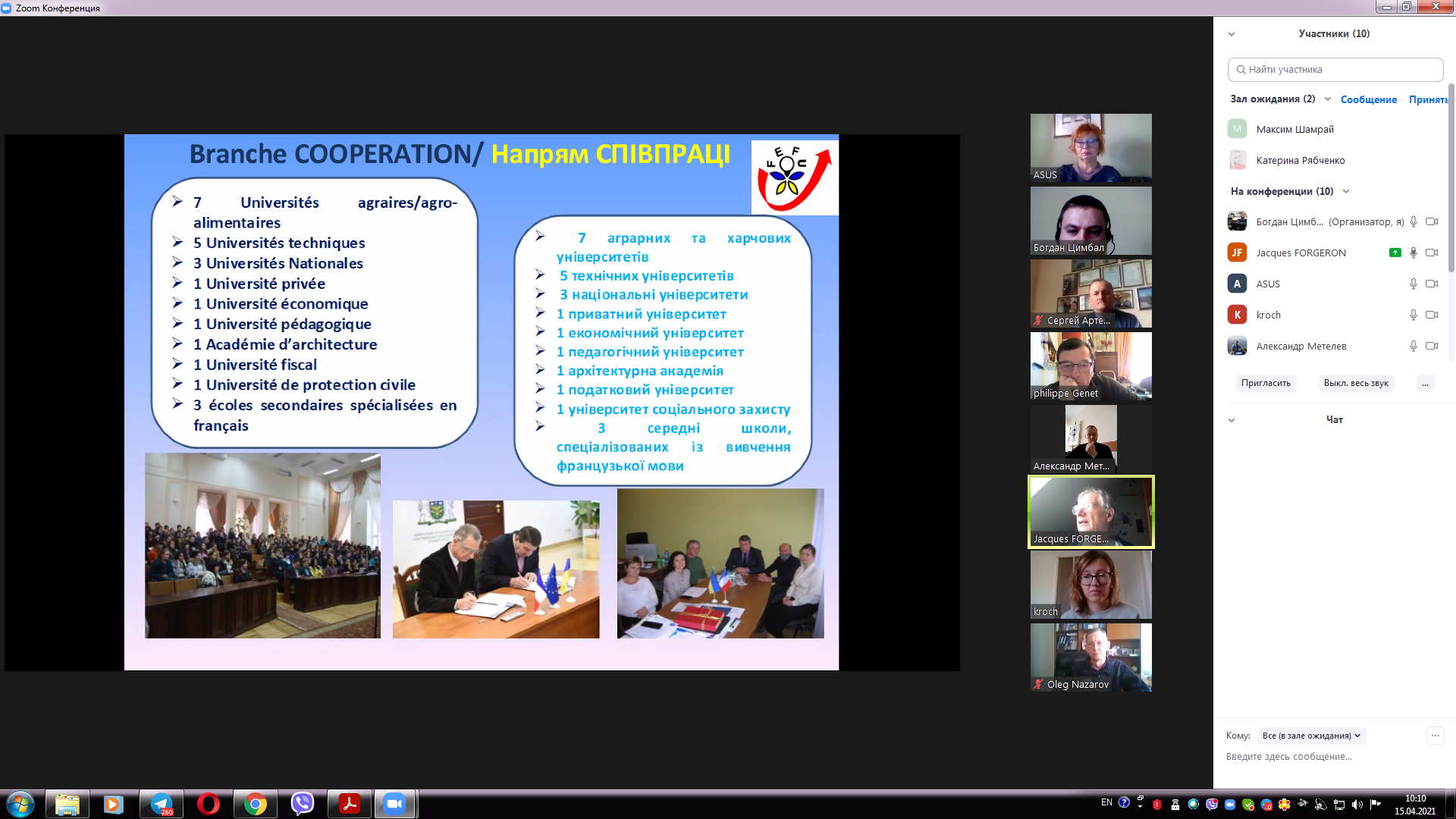 15 квітня 2021 року відбулася онлайн зустріч керівництва університету з представниками Федерації «Обміни Франція Україна» та Асоціації Пуату Шарант Україна. На зустрічі були присутні Жак ФОРЖЕРОН співпрезидент Федерації "Обміни Франція-Україна", відповідальний за відділ співпраці Філіп ЖЕНЕ президент Асоціації "Співпраця Пуату Шарант Україна", відповідальний за організацію стажувань в аграрній сфері Ольга ГОНСЕ секретар Федерації, від університету проректор з навчальної роботи Олег НАЗАРОВ, помічник ректора з міжнародного співробітництва Денис ЛЄБЄДЄВ, декан факультету техногенно-екологічної безпеки Олександр МЄТЄЛЬОВ, доценти кафедри охорони праці та техногенно-екологічної безпеки Ольга РИБАЛОВА, Богдан ЦИМБАЛ, Олена ШАРОВАТОВА. На зустрічі було представлено діяльність Федерації Франції Україна, а також визначені перспективні напрямки діяльності, зокрема проведення професійних зустрічей та конференцій з фахівцями-практиками в галузі екології та охорони праці, які будуть проведені у наступному навчальному році починаючи з вересня місяця.